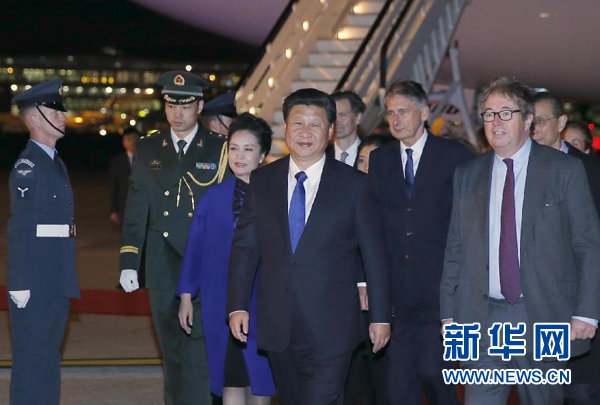 當?shù)貢r間晚8時許,習近平乘坐的專機抵達倫敦希思羅機場。習近平和夫人彭麗媛在機場受到英國女王代表胡德子爵、外交大臣哈蒙德等熱情迎接。英國青年向習近平夫婦獻上鮮花。