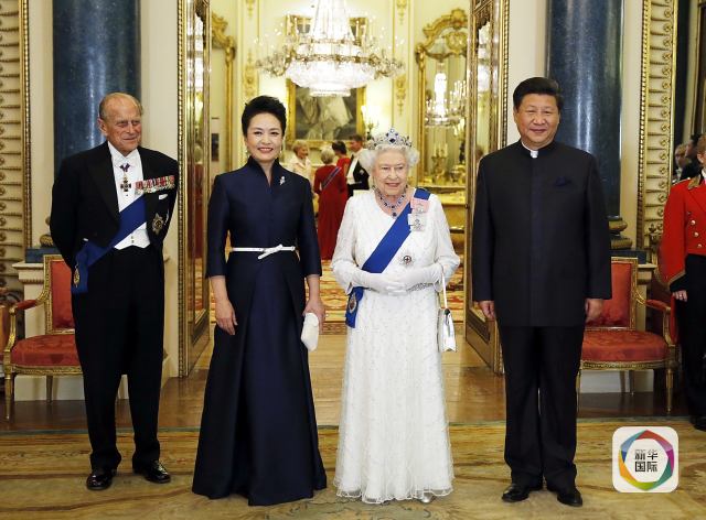 國家主席習近平和夫人彭麗媛在倫敦白金漢宮出席英國女王伊麗莎白二世舉行的歡迎晚宴。(鞠鵬攝)