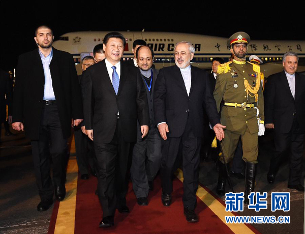 圖為1月22日,國(guó)家主席習(xí)近平乘專(zhuān)機(jī)抵達(dá)伊朗首都德黑蘭,開(kāi)始對(duì)伊朗進(jìn)行國(guó)事訪問(wèn)。這是在梅赫拉巴德機(jī)場(chǎng),習(xí)近平受到伊朗外交部長(zhǎng)扎里夫等熱情迎接。(新華社記者饒愛(ài)民攝)