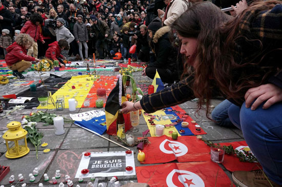 3月23日,在比利時布魯塞爾,人們在悼念活動中擺放蠟燭。22日在比利時首都布魯塞爾發(fā)生的系列恐怖襲擊已造成至少34人死亡,270多人受傷。事發(fā)后,布魯塞爾多地舉行活動,悼念恐怖襲擊事件中的遇難者。新華社/法新