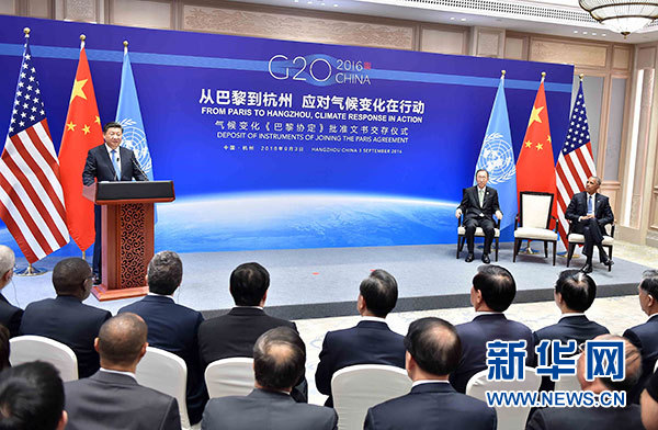 新華社杭州9月3日電(記者劉華、馮源)國家主席習近平3日同美國總統奧巴馬、聯合國秘書長潘基文在杭州共同出席氣候變化《巴黎協定》批準文書交存儀式。