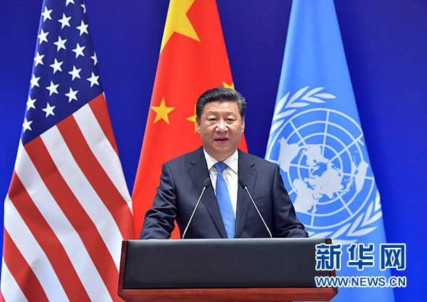 習近平強調,中國是最大的發展中國家,美國是最大的發達國家,兩國在氣候變化領域開展了卓有成效的對話和合作。兩國共同交存參加《巴黎協定》法律文書,展示了共同應對全球性問題的雄心和決心。國際社會應該以落實《巴黎協定》為契機,加倍努力,不斷加強和完善全球治理體系,創新應對氣候變化路徑,推動《巴黎協定》早日生效和全面落實。我們要堅持共同但有區別的責任原則、公平原則、各自能力原則,按照巴黎大會授權,穩步推進后續談判,有效應對氣候變化挑戰。發達國家要履行承諾,提供資金技術支持,增強發展中國家應對氣候變化能力。