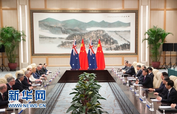 習(xí)近平指出,中方高度重視發(fā)展中澳關(guān)系。希望雙方相向而行,堅(jiān)持互信互利原則,拓展務(wù)實(shí)合作,擴(kuò)大人文交流,推動(dòng)中澳全面戰(zhàn)略伙伴關(guān)系健康穩(wěn)定向前發(fā)展。互信是保證中澳關(guān)系順利發(fā)展的前提。中澳要尊重彼此對(duì)發(fā)展道路的選擇,尊重彼此核心利益和重大關(guān)切。我們要加強(qiáng)優(yōu)勢(shì)互補(bǔ),繼續(xù)實(shí)施好中澳自由貿(mào)易協(xié)定,加快推進(jìn)中方“一帶一路”倡議同澳方“北部大開發(fā)”計(jì)劃對(duì)接,積極拓展能源資源、農(nóng)牧業(yè)、食品加工、基礎(chǔ)設(shè)施建設(shè)等領(lǐng)域合作,更好實(shí)現(xiàn)互利雙贏。希望澳方繼續(xù)致力于為外資提供公平、透明、可預(yù)期的政策環(huán)境,這也符合澳方自身利益。要深入推進(jìn)創(chuàng)新發(fā)展戰(zhàn)略對(duì)接,擴(kuò)大食品、農(nóng)業(yè)、礦業(yè)、海洋科學(xué)等領(lǐng)域聯(lián)合研發(fā)。要深化教育、文化、旅游等領(lǐng)域交流,增進(jìn)兩國人民相互了解和友誼。要加強(qiáng)反腐敗追逃追贓和反恐合作。中方愿同澳方加強(qiáng)在聯(lián)合國、二十國集團(tuán)、亞太經(jīng)合組織、東亞峰會(huì)等機(jī)制中的協(xié)調(diào)和合作。