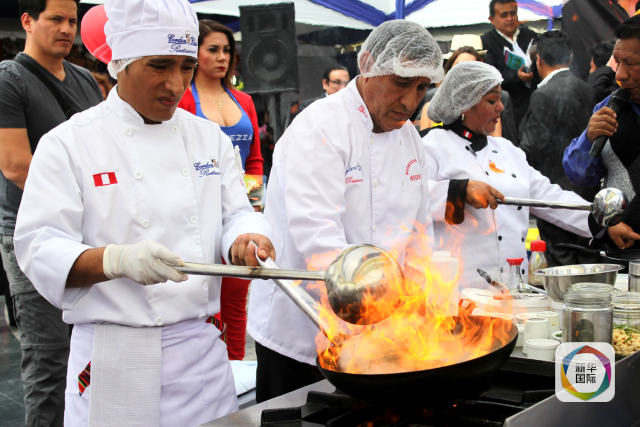 2015年9月17日,兩名廚師在秘魯美食創新大賽上進行炒飯技能比拼。(新華社發 路易斯·卡馬喬攝)