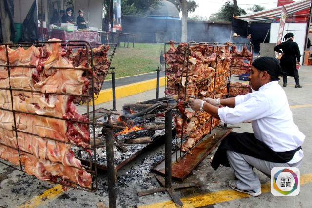 2015年6月20日,秘魯首都利馬舉行美食節。圖為一名廚師正在制作烤豬。(新華社發 路易斯·卡馬喬攝)