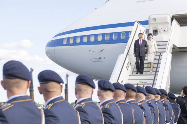 專機進入德國領空,兩架德國空軍戰機升空護航。專機抵達柏林,習近平主席和夫人彭麗媛步出艙門,現場鳴21響禮炮,戰機在空中飛越致意。