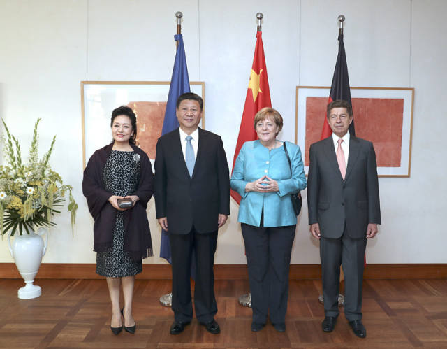 當地時間7月4日晚,剛剛抵達柏林的國家主席習近平在利伯曼故居同德國總理默克爾舉行會見。這是習近平和夫人彭麗媛抵達位于柏林市中心勃蘭登堡門附近的利伯曼故居時,受到默克爾和丈夫紹爾熱情迎接。(新華社記者馬占成攝)