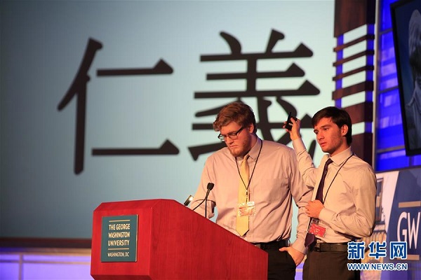 11月18日,在美國首都華盛頓的喬治·華盛頓大學(xué),參賽選手進(jìn)行中文演講。美國喬治·華盛頓大學(xué)中國學(xué)生學(xué)者聯(lián)合會和喬治·華盛頓大學(xué)孔子學(xué)院聯(lián)合主辦的第一屆“華語擂臺”漢語辯論賽18日落下帷幕。來自賓夕法尼亞州、猶他州、佛羅里達(dá)州等美國多地的10名參賽者兩兩組隊,通過成語挑戰(zhàn)、現(xiàn)場問答和團(tuán)隊辯論三種形式,展示了各自的漢語知識、語言和思辨能力及個人風(fēng)采。新華社記者 楊承霖 攝