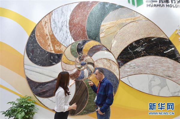敘利亞客商默罕默德(右)在一家國內(nèi)石材企業(yè)展位的“海螺狀”石材墻前(11月8日攝)。11月8日,第十八屆中國(南安)水頭國際石材博覽會在福建省南安市水頭鎮(zhèn)舉辦。 新華社記者 宋為偉 攝