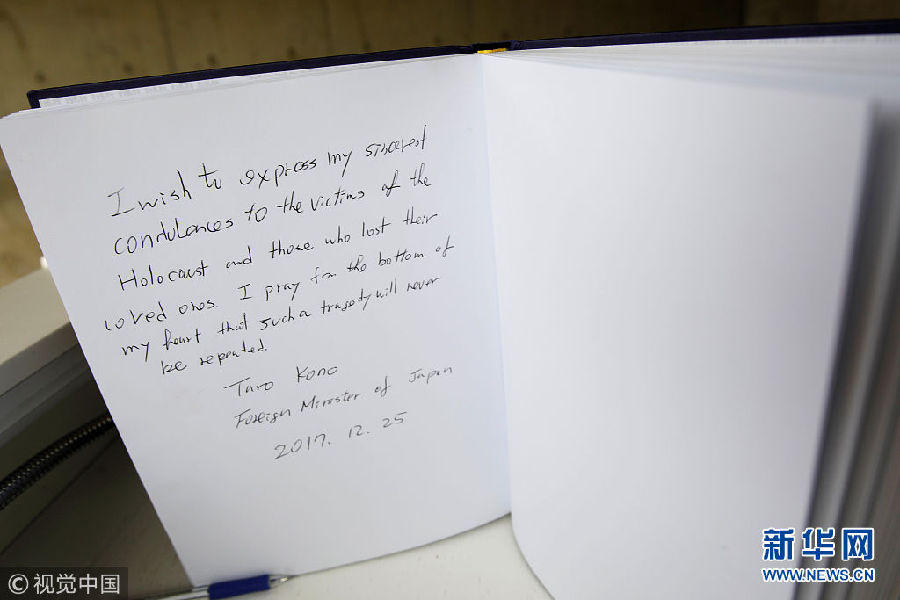 12月25日,耶路撒冷,日本外相河野太郎訪問耶路撒冷,參觀大屠殺紀念館,獻花悼念死難者。 (圖片來源:視覺中國)