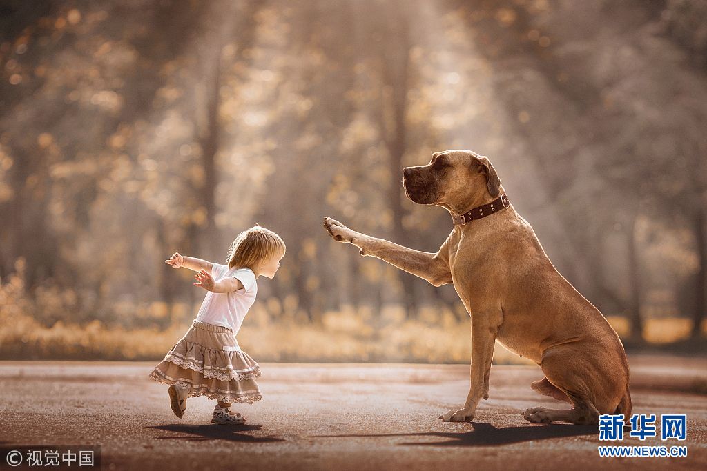 1歲零7個月的Alice和5歲大的大丹犬Sean一起玩,Sean重82公斤高達95厘米。(圖片來源:視覺中國)