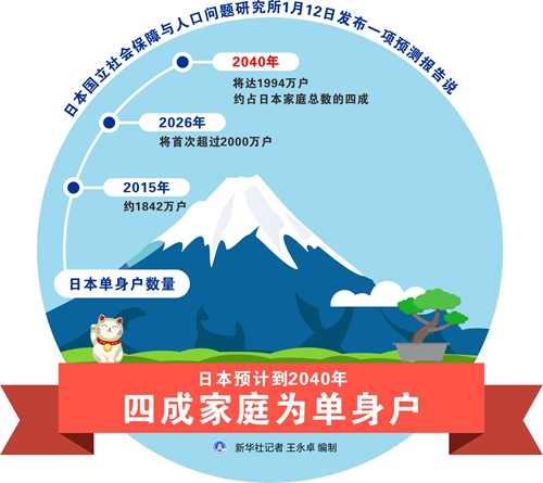新華社東京1月13日電(記者華義)日本國立社會保障與人口問題研究所12日發布一項預測報告說,到2040年日本單身戶將占日本家庭總數的約四成。日本老齡化和獨居現象日益加劇。