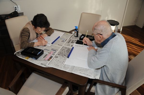 資料圖片:2017年2月27日,在位于日本東京品川區(qū)的養(yǎng)老院“日醫(yī)HOME南品川”,兩名老人在練習描字。新華社記者華義攝