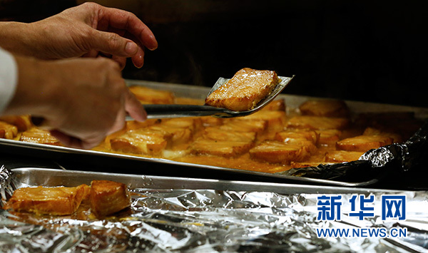 2月8日,在美國洛杉磯,廚師制作烤鱈魚。 新華社記者 李穎 攝