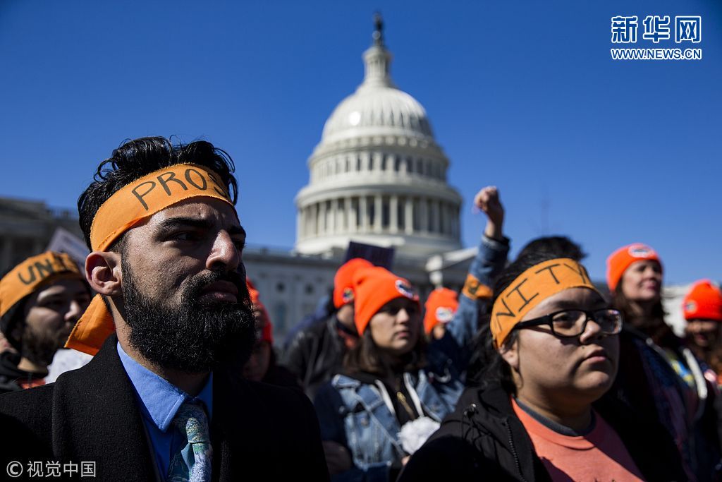 當地時間2018年3月5日,美國華盛頓,移民活動家在國會山舉行集會,抗議特朗普終結“夢想法案”計劃。(圖片來源:視覺中國)