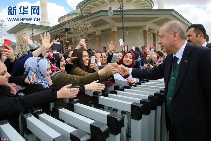 當地時間3月30日,土耳其安卡拉,土耳其總統埃爾多安在星期五禮拜結束后與民眾打招呼。(圖片來源:東方IC)