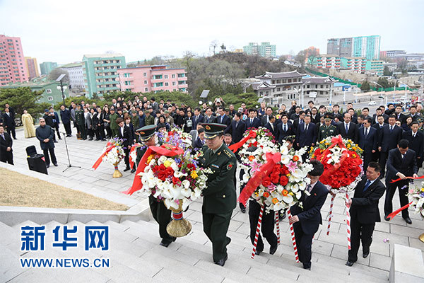 4月5日,在朝鮮平壤,中國駐朝鮮大使館在平壤友誼塔舉行敬獻(xiàn)花籃儀式,祭奠中國人民志愿軍烈士。新華社記者 程大雨 攝