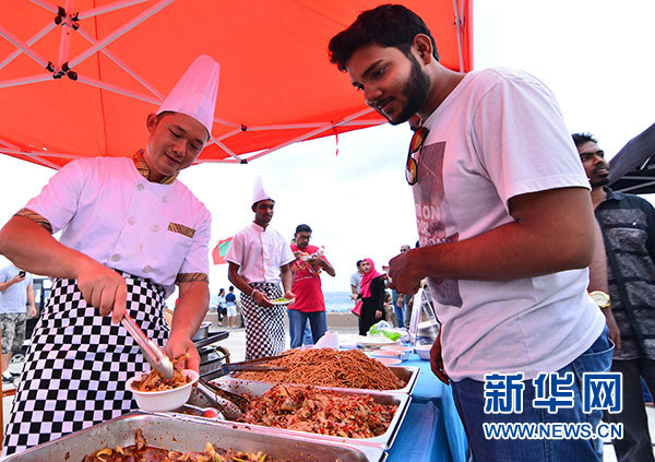 5月4日,在馬爾代夫首都馬累市中心停機坪廣場,一名當地男子(右)品嘗中國美食。 新華社發(杜才良 攝)