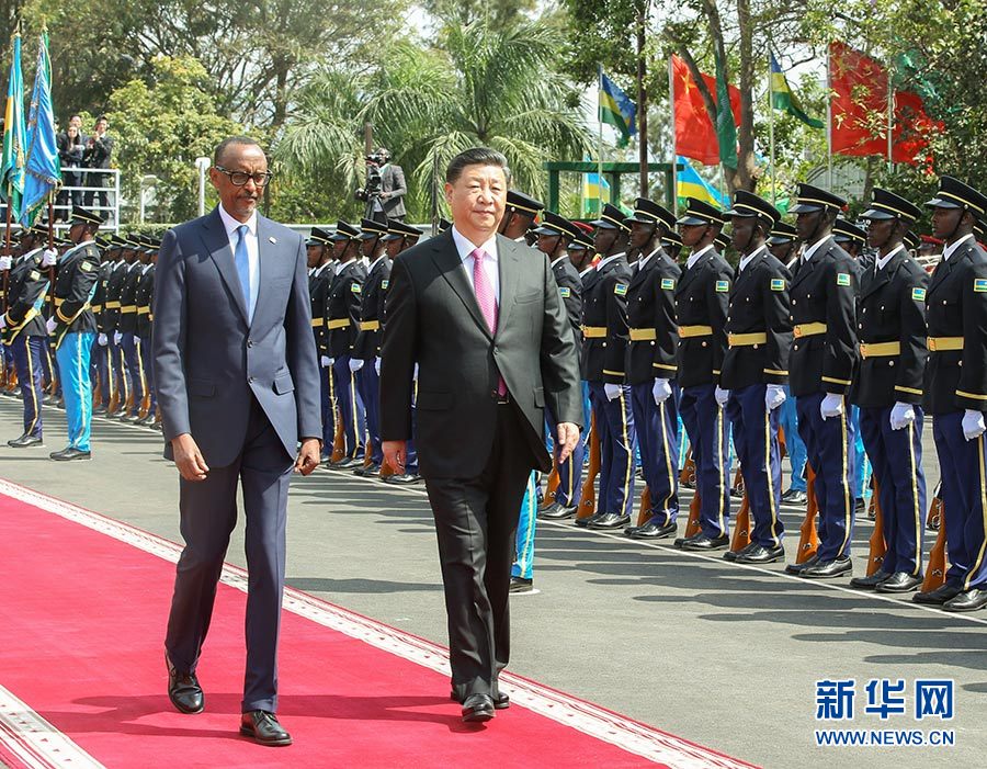 習近平和夫人彭麗媛抵達總統府時,卡加梅和夫人珍妮特上前迎接。兩國元首登上檢閱臺。軍樂隊奏中盧兩國國歌。在卡加梅陪同下,習近平檢閱儀仗隊。習近平和彭麗媛同盧方主要官員握手。卡加梅夫婦同中方陪同人員握手。身著民族服裝的當地民眾,通過別具特色的盧旺達舞蹈和鼓樂表演,抒發對習近平到訪的激動和喜悅。