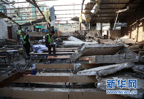 新華社報道員在現場看到,此次襲擊威力巨大,遇襲教室內的天花板在爆炸中嚴重受損,從黑板、座椅到地面,到處都能看到尚未來得及清理的血跡,學員們的課本、文具等四處散落。教室外不時有家長趕來,急切打聽自家孩子的下落。