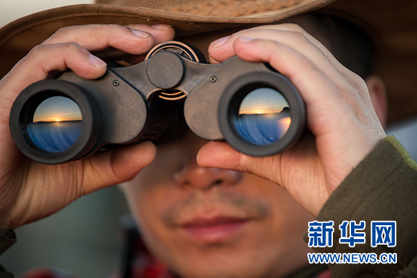7月7日,在肯尼亞馬賽馬拉大草原奧肯耶保護區,卓強用望遠鏡觀察保護區情況。新華社記者 呂帥 攝