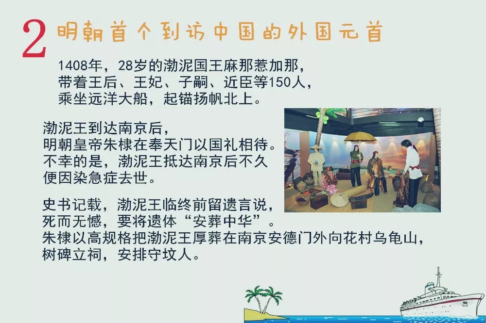 因擔心渤泥政局動蕩,朱棣還特派張謙、周航兩位使臣護送太子遐旺返回渤泥襲王位并助他鎮守一年。1412年農歷九月,新國王遐旺帶著母親、叔父等一批人再次訪華。明朝歷史上,外國國王來訪,渤泥王麻那惹加那是第一人。