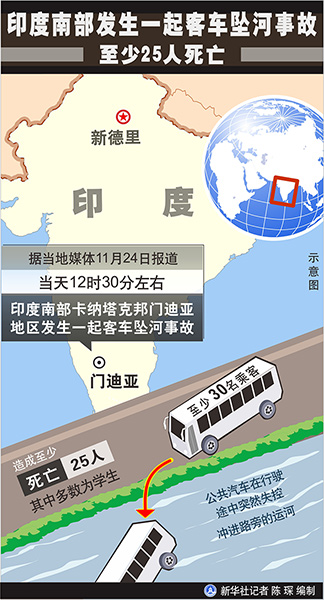 圖表:印度南部發(fā)生一起客車墜河事故 至少25人死亡 新華社記者 陳琛 編制
