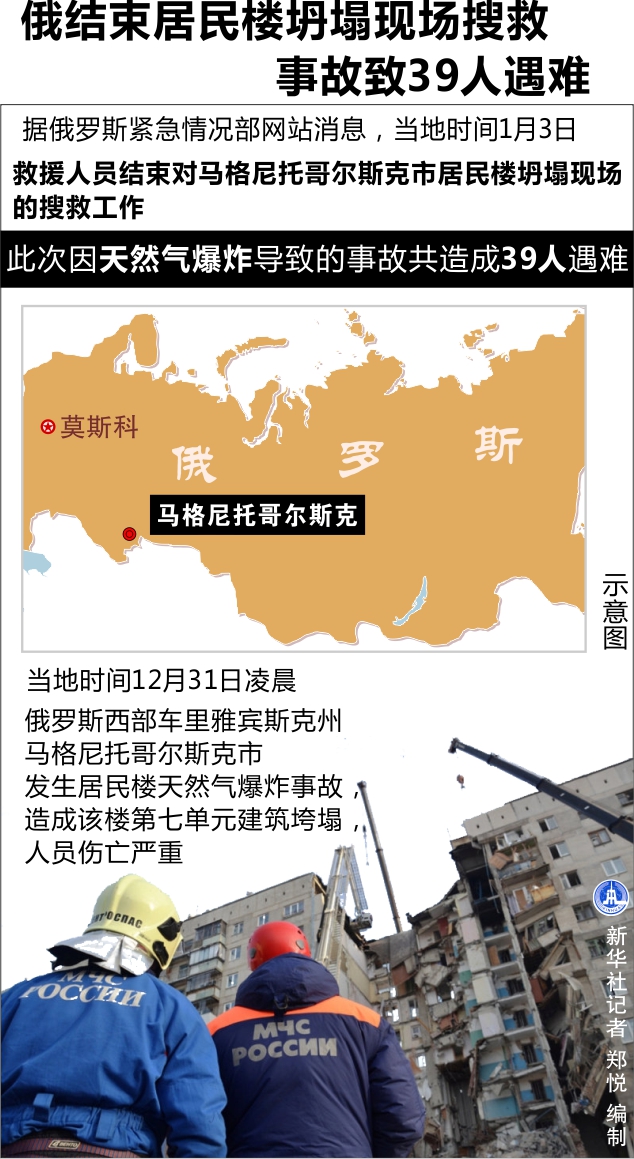 新華社莫斯科1月3日電(記者欒海)據俄羅斯緊急情況部網站消息,救援人員3日結束對馬格尼托哥爾斯克市居民樓坍塌現場的搜救工作,此次因天然氣爆炸導致的事故共造成39人遇難。