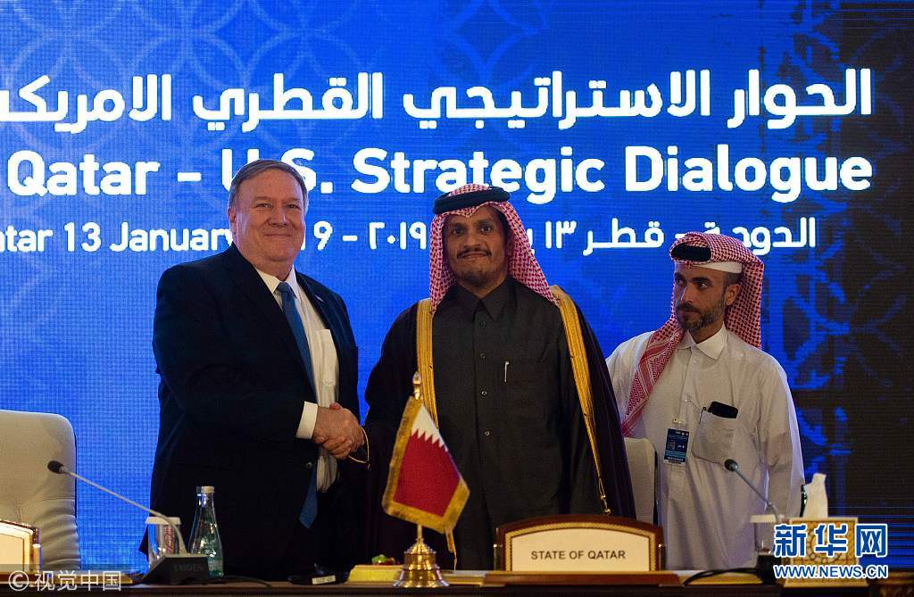 2019年1月13日,卡塔爾多哈,美國國務卿邁克·蓬佩奧訪問卡塔爾。蓬佩奧與卡塔爾副首相兼外交大臣穆罕默德在多哈的喜來登大酒店簽署了諒解備忘錄和意向聲明并舉行聯合記者會。蓬佩奧表示,兩國外交部門領導人當天簽署了一份諒解備忘錄,將擴建和改造烏代德美國空軍基地。(圖片來源:視覺中國)