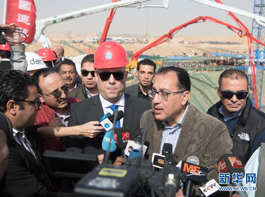 2月25日,在埃及開羅以東約50公里處的新首都中央商務區,埃及總理穆斯塔法·馬德布利(右二)接受媒體采訪。 埃及總理穆斯塔法·馬德布利25日上午視察了由中國建筑股份有限公司承建的埃及新首都中央商務區,并見證了標志塔主樓1.85萬立方米超大型混凝土基礎底板開盤澆筑。埃及新行政首都中央商務區位于首都開羅以東約50公里處,總占地面積約50.5萬平方米,包含20個高層建筑單體及配套市政工程。 新華社記者鄔惠我攝