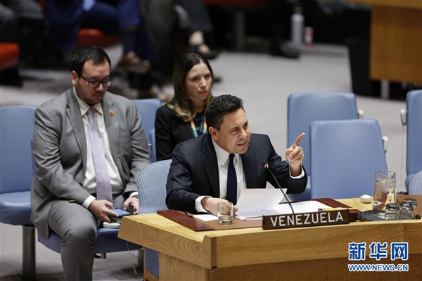2月28日,在位于紐約的聯(lián)合國總部,委內(nèi)瑞拉常駐聯(lián)合國代表薩穆埃爾·蒙卡達(前)在安理會會議上發(fā)言。 新華社記者 李木子 攝