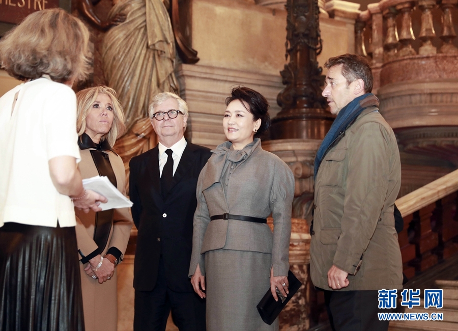 當?shù)貢r間3月25日,國家主席習近平夫人彭麗媛在法國總統(tǒng)夫人布麗吉特陪同下參觀位于巴黎市第九區(qū)的法國巴黎歌劇院。 新華社記者 丁林 攝