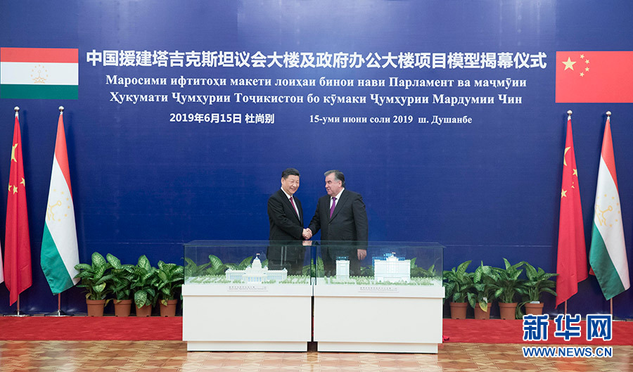 6月15日,國家主席習近平在杜尚別同塔吉克斯坦總統(tǒng)拉赫蒙會談。會談后,兩國元首共同出席中方援塔議會大樓、政府辦公大樓項目模型揭幕儀式。 新華社記者 王曄 攝