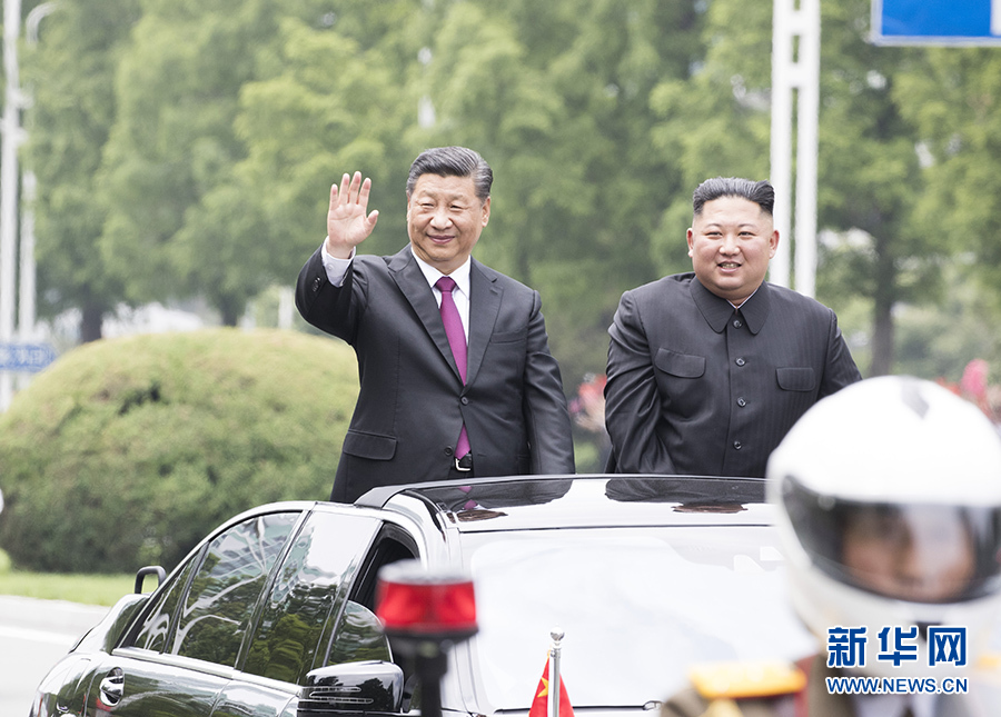 6月20日,中共中央總書記、國家主席習近平乘專機抵達平壤,開始對朝鮮民主主義人民共和國進行國事訪問。朝鮮勞動黨委員長、國務委員會委員長金正恩和夫人李雪主到機場熱情迎接習近平和夫人彭麗媛。朝方在機場舉行隆重歡迎儀式。歡迎儀式結束后,習近平與金正恩同車前往錦繡山太陽宮廣場,沿途數十萬群眾夾道歡迎。 新華社記者 申宏 攝