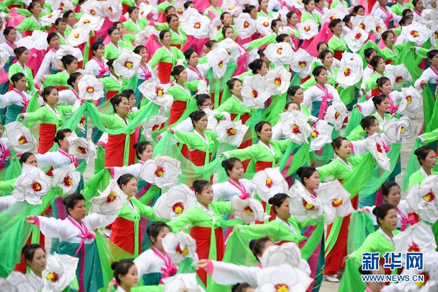 明媚的陽(yáng)光下,錦繡山太陽(yáng)宮廣場(chǎng)顯得格外雄偉,金日成、金正日的巨幅畫(huà)像并排高高懸掛,大型花壇鋪展在寬闊的廣場(chǎng)中間。錦繡山太陽(yáng)宮廣場(chǎng)上,歡迎的人群身著節(jié)日的盛裝,呈方陣排列。