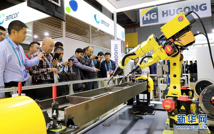 11月6日,在進(jìn)博會(huì)裝備展區(qū),一組正在進(jìn)行作業(yè)演示的焊接機(jī)器人吸引了參觀者的目光。當(dāng)日是第二屆中國國際進(jìn)口博覽會(huì)開幕第二天,上海國家會(huì)展中心迎來首個(gè)“大客流”。新華社記者 方喆 攝