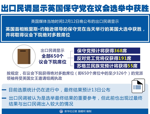 新華社倫敦12月12日電(記者桂濤 張代蕾)英國(guó)媒體12日晚公布的出口民調(diào)顯示,英國(guó)首相鮑里斯·約翰遜領(lǐng)導(dǎo)的保守黨在當(dāng)天舉行的英國(guó)大選中獲勝,并將取得議會(huì)下院絕對(duì)多數(shù)席位。
