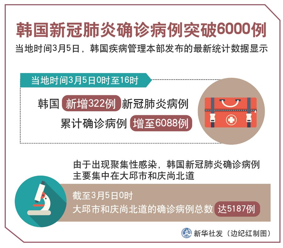 新華社首爾3月5日電(記者陸睿 耿學鵬)韓國疾病管理本部5日發布的最新統計數據顯示,當地時間5日0時至16時,韓國新增322例新冠肺炎病例,累計確診病例增至6088例。