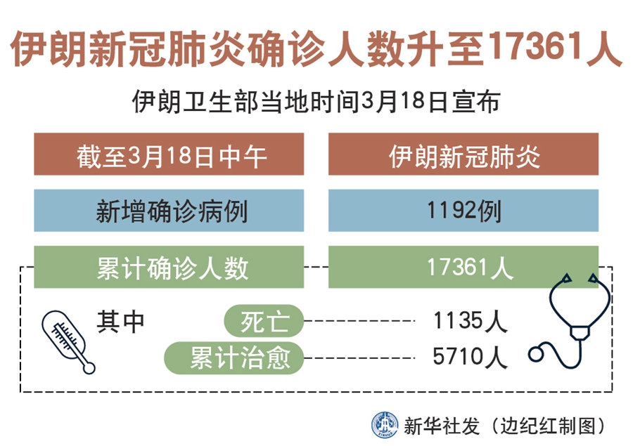 新華社德黑蘭3月18日電(記者陳霖)伊朗衛生部18日宣布,截至18日中午,伊朗新增新冠肺炎確診病例1192例,累計確診人數達到17361人,其中1135人死亡,累計治愈5710人。