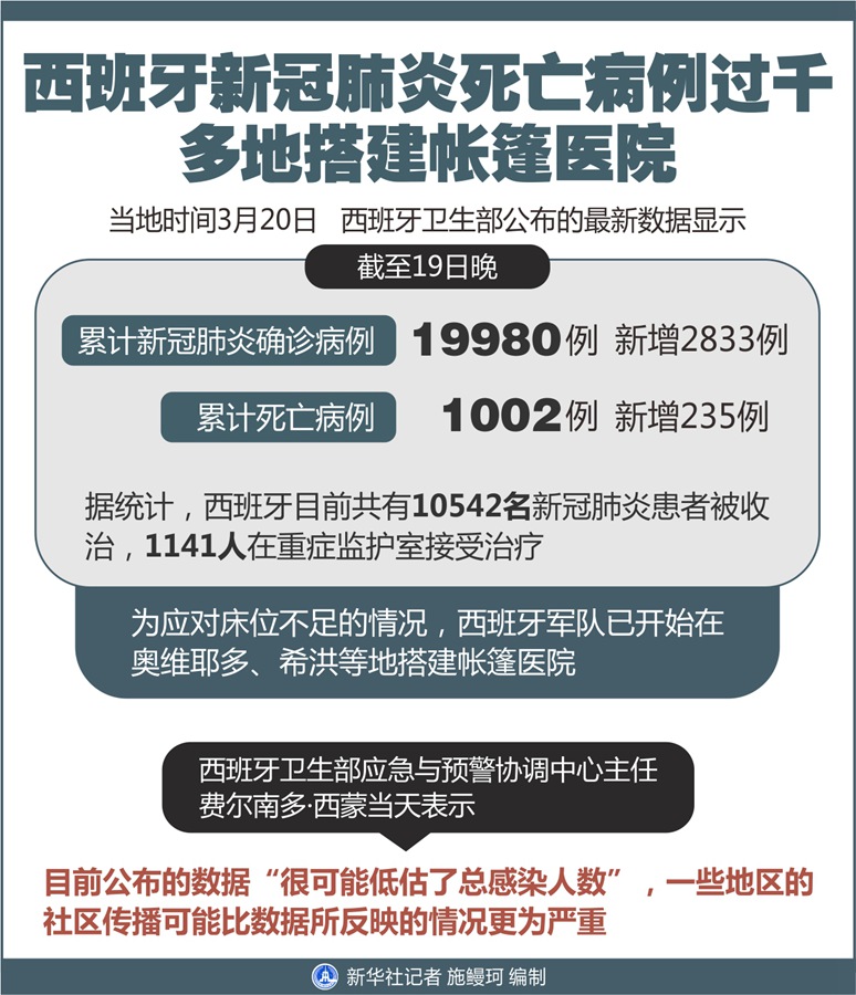 新華社馬德里3月20日電(謝宇智)西班牙衛生部20日公布的最新數據顯示,截至19日晚,西班牙累計新冠肺炎確診病例19980例,新增2833例;累計死亡病例1002例,新增235例。