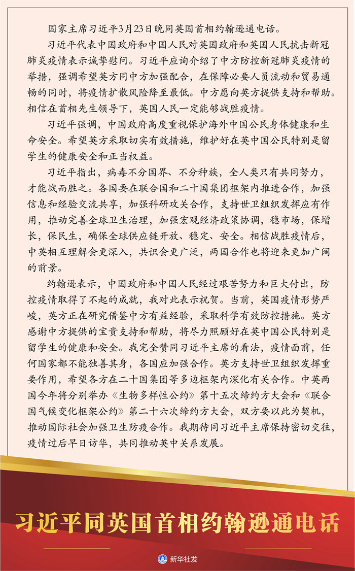 習近平指出,病毒不分國界、不分種族,全人類只有共同努力,才能戰(zhàn)而勝之。各國要在聯(lián)合國和二十國集團框架內(nèi)推進合作,加強信息和經(jīng)驗交流共享,加強科研攻關(guān)合作,支持世衛(wèi)組織發(fā)揮應(yīng)有作用,推動完善全球衛(wèi)生治理,加強宏觀經(jīng)濟政策協(xié)調(diào),穩(wěn)市場,保增長,保民生,確保全球供應(yīng)鏈開放、穩(wěn)定、安全。相信戰(zhàn)勝疫情后,中英相互理解會更深入,共識會更廣泛,兩國合作也將迎來更加廣闊的前景。