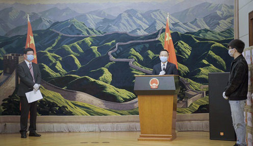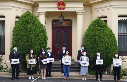 中國駐墨爾本總領(lǐng)館轄區(qū)內(nèi)多所大學(xué)的學(xué)生代表參加發(fā)放儀式并領(lǐng)取了“健康包”。教育參贊郭春鳴,協(xié)助發(fā)放工作的維州中文教師協(xié)會、澳洲國際商學(xué)院的代表也出席了儀式。