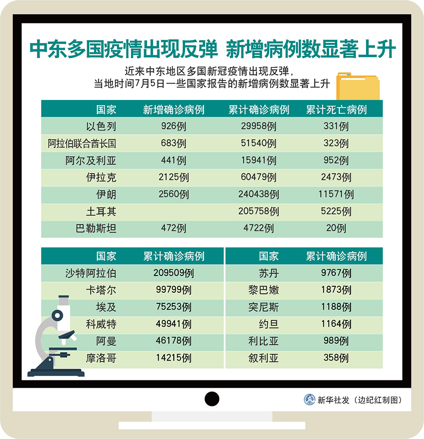 新華社喀土穆7月5日電 綜合新華社駐中東地區(qū)記者報道:近來中東地區(qū)多國新冠疫情出現(xiàn)反彈,一些國家5日報告的新增病例數(shù)顯著上升,多國政府敦促民眾嚴(yán)格落實防控措施。