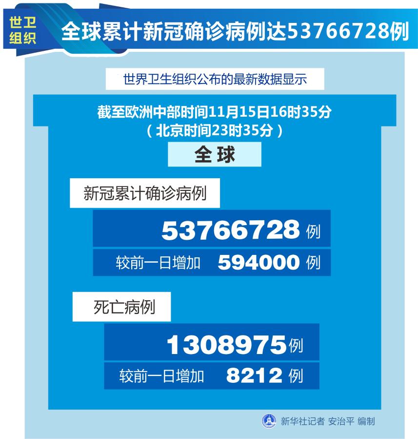 新華社日內瓦11月15日電(記者劉曲)世界衛生組織15日公布的最新數據顯示,全球累計新冠確診病例達53766728例。