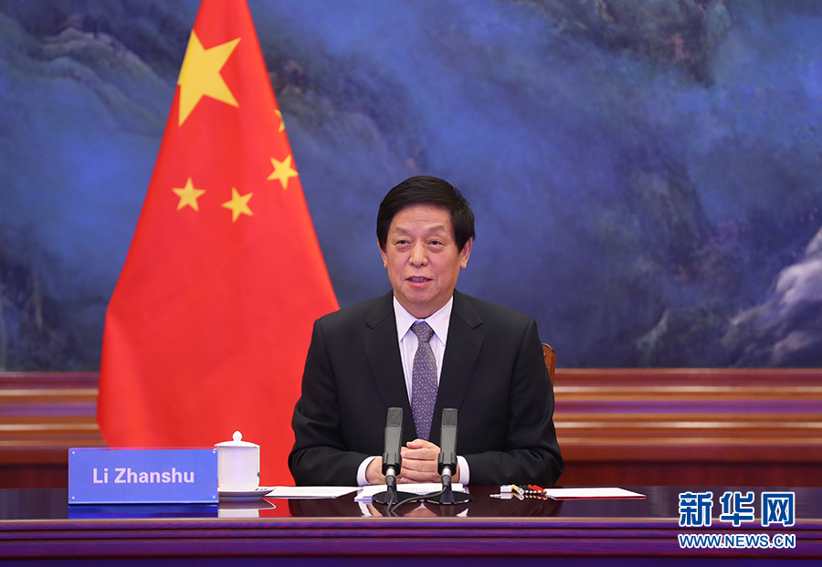 11月23日,全國(guó)人大常委會(huì)委員長(zhǎng)栗戰(zhàn)書在北京以視頻方式同老撾國(guó)會(huì)主席巴妮舉行會(huì)談。新華社記者 姚大偉 攝