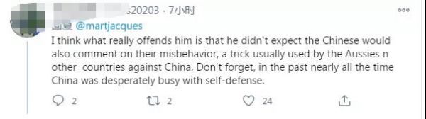 在這條推特下邊,許多網(wǎng)友為馬丁·雅克點贊。其中一位網(wǎng)友說道:“我認為真正讓他惱火的是,他沒想到中國人也會對他們的不當行為發(fā)表評論,這是澳大利亞人和其他國家對付中國的慣用伎倆。別忘了,在過去幾乎所有的時間里,中國都在拼命地進行自衛(wèi)。”