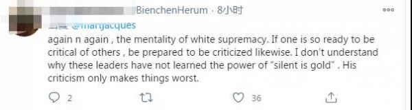 “又一次,白人至上的心態(tài)。如果一個人準備好批評別人,也要準備好同樣地被批評。我不明白為什么這些領導人沒有學會‘沉默就是金子’的力量。他的批評只會讓事情變得更糟。”