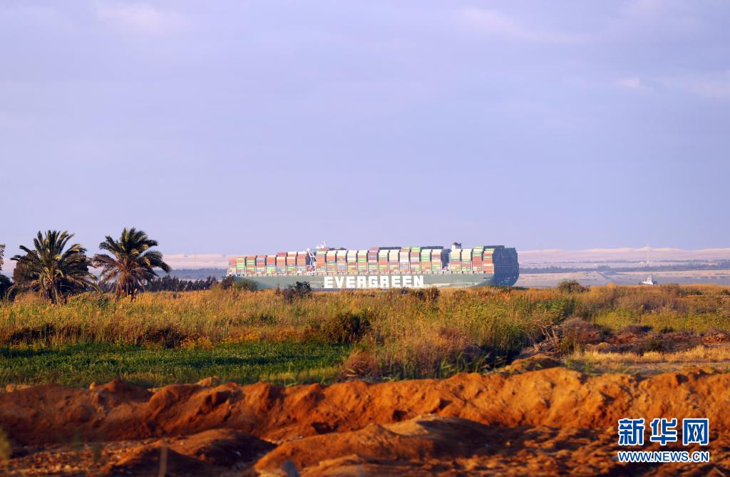 這是3月29日拍攝的移動至埃及蘇伊士運河正常航道上的重型貨輪。新華社發(艾哈邁德·戈馬 攝)